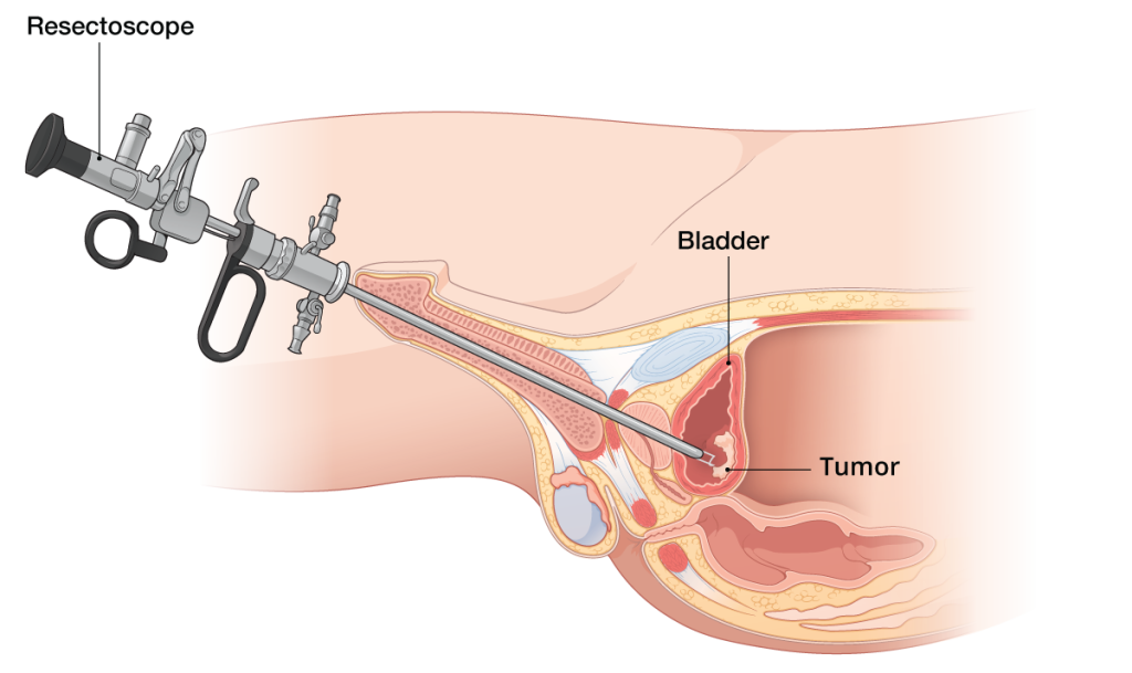 For bladder cancer, transurethral resection of bladder tumor (TURBT) diagnoses and treats superficial disease, often with intravesical BCG immunotherapy to prevent recurrence.